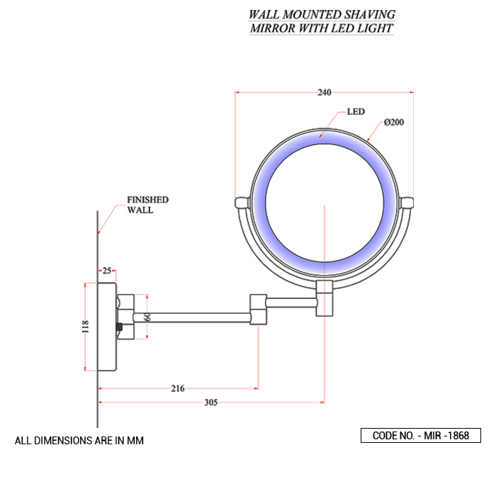 One Side Wall Mounted Shaving Mirror with Led Light 220 V with Plug